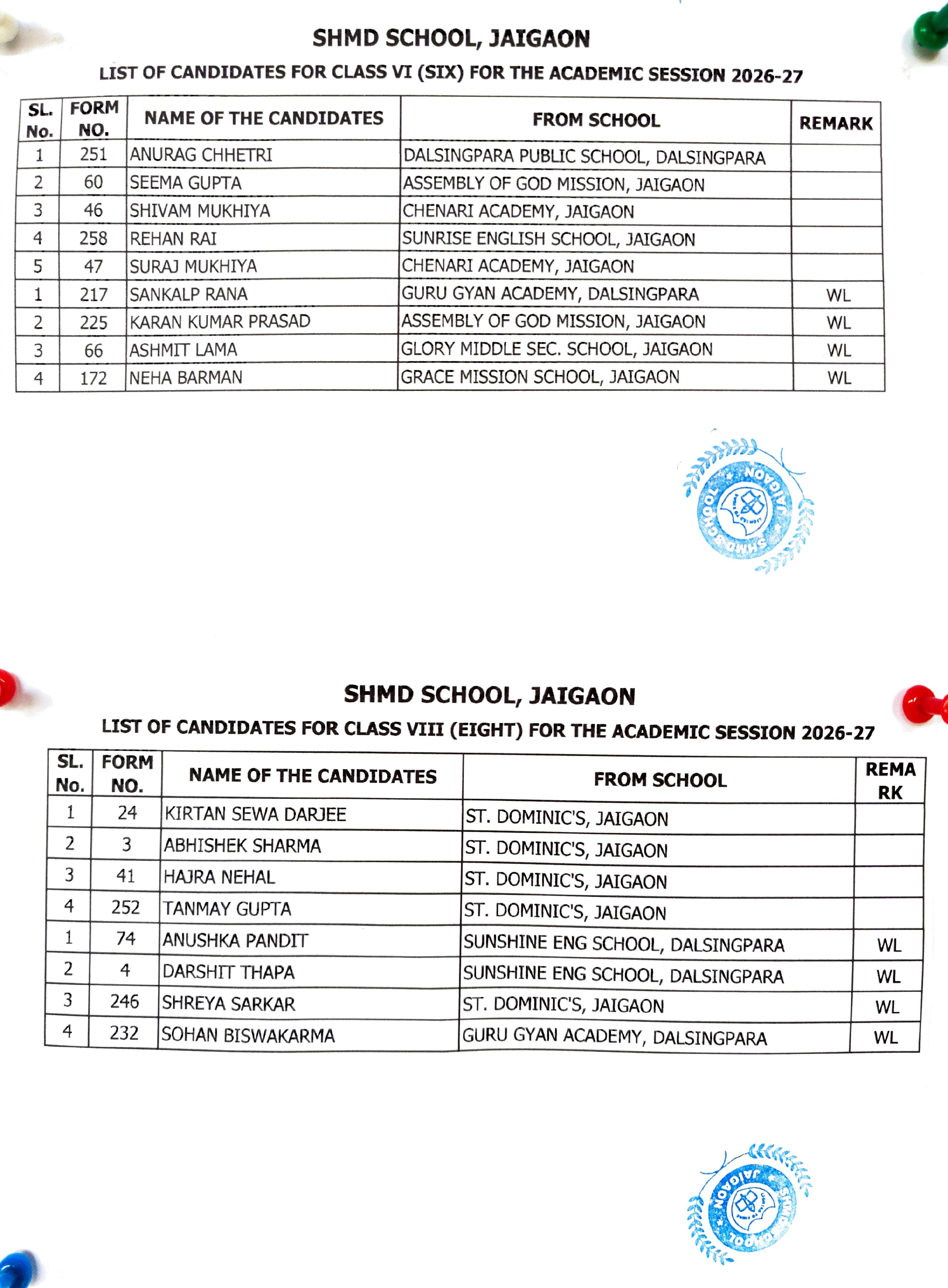 Admission Test Results VI & VIII